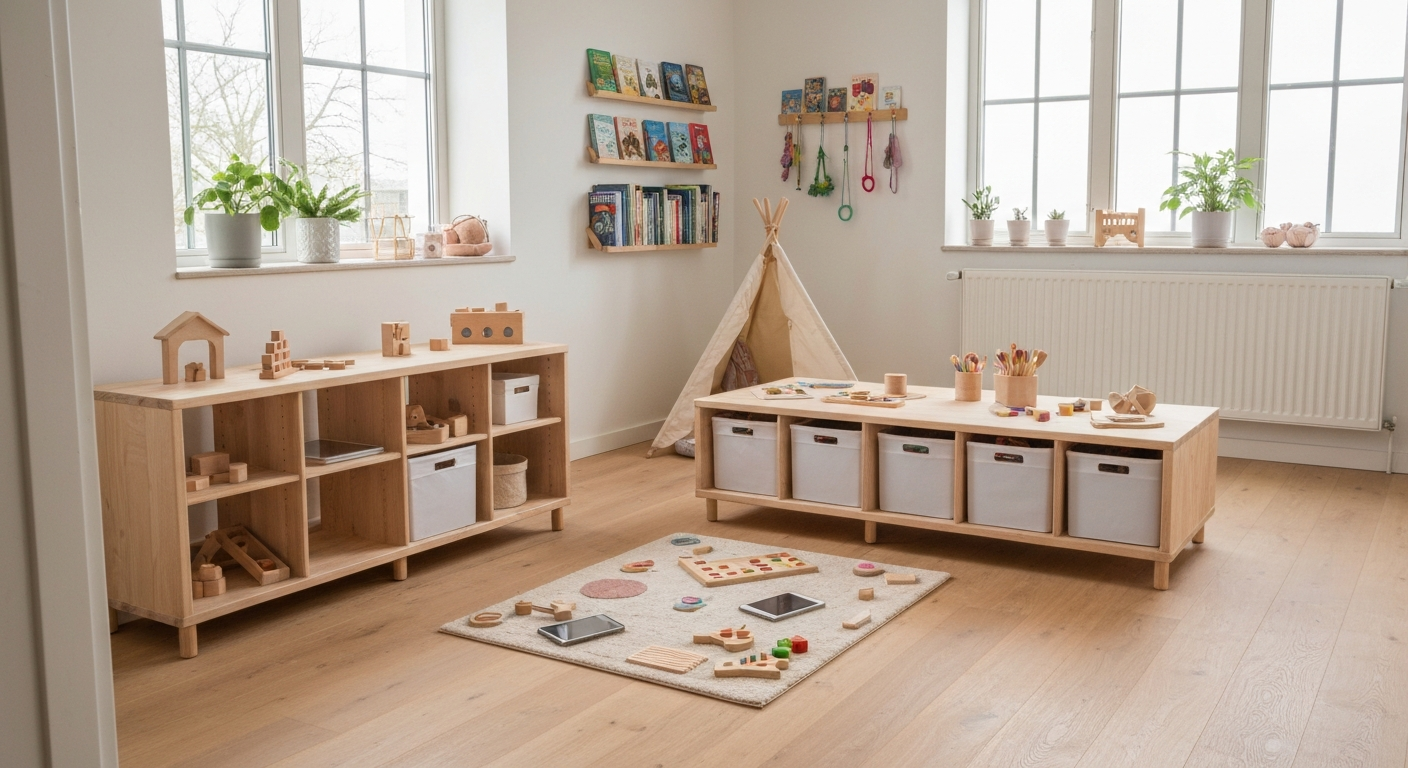 - Montessori-inspirierte offene Regale fördern die Selbstständigkeit der Kinder enorm.